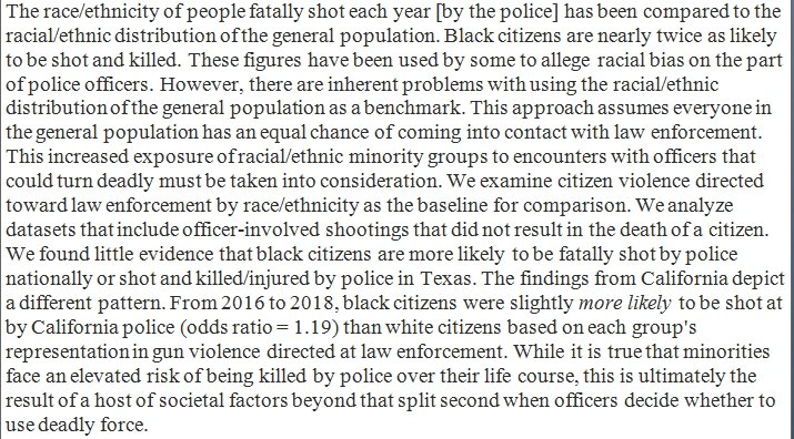 "We found little evidence that black citizens are more likely to be fatally shot by police nationally or shot and killed/injured by police in Texas. Black citizens were slightly more likely to be shot at by California police." https://www.sciencedirect.com/science/article/pii/S0047235219304398 …pic.twitter.com/xaf4oWakeu