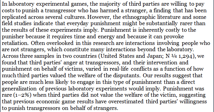 Third-party punishment, the punishment of someone who harmed another person, is rarer in real life than previously thought and occurs only when the punisher values the welfare of the victim. https://journals.sagepub.com/doi/abs/10.1177/1948550619884565 …pic.twitter.com/1CxuWqyQoL