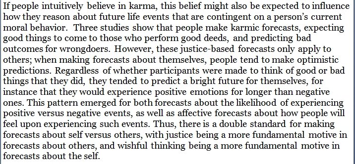 People make "karmic" forecasts for other people, expecting good things to come to those who do good and bad things to come to wrongdoers. For themselves, they make rosy non-karmic forecasts. https://psycnet.apa.org/record/2019-78487-001 …pic.twitter.com/UJkMvSrMGt