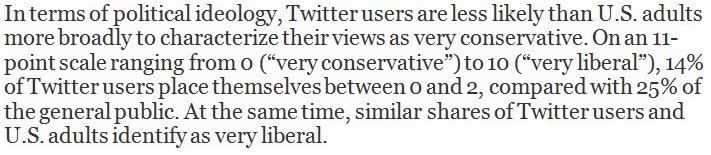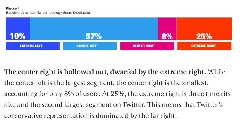 A study by Pew Research that used self-reported political affiliation came to different conclusions about Twitter users. Results seem to be very sensitive to the criterion you apply. https://www.pewresearch.org/internet/2019/04/24/sizing-up-twitter-users/ …pic.twitter.com/gglL9dY7O4
