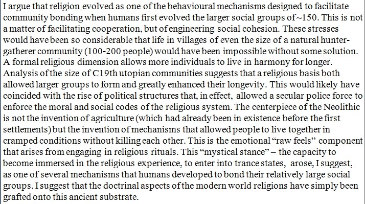 Robin Dunbar argues that religion evolved to allow humans to live together in previously unknown large-scale communities without killing each other. https://ora.ox.ac.uk/objects/uuid:259dc012-8806-4ca6-92f2-2eaf1ff6c002 …pic.twitter.com/lWSgDVdT1Q