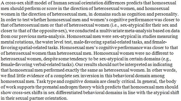 Again: This is because as far as I know, homosexuality is an in utero developmental failure that was insufficient to produce either male brain or miscarriage.The two most common theories attribute this to immune system responses to internal (genetic) or external (viral) stimulus.