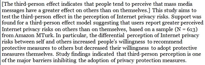 People think that everybody else is more susceptible to internet privacy risks than themselves. https://journals.sagepub.com/doi/abs/10.1177/1461444820902103 … https://twitter.com/DegenRolf/status/851385787128180737 …pic.twitter.com/MjlmSKSeCv