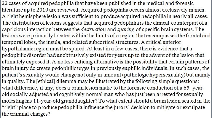The medical literature contains 22 cases of individuals - almost exclusively men - who developed pedophilia after the advent of a brain lesion, predominantly in the right hemisphere. https://www.tandfonline.com/doi/full/10.1080/13554794.2020.1727929 …pic.twitter.com/AWclLMP4F2
