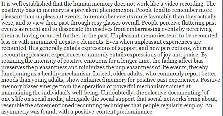 Maybe it’s a problem of how to phrase the phenomenon. It’s not so much that one forgets or distorts bad aspects, but the intense emotional stress leaks out of most memories over the years, no?