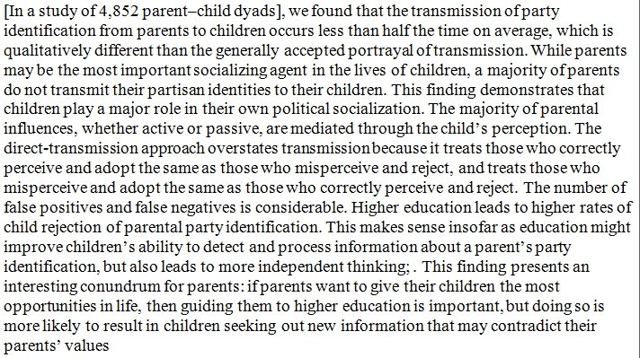 Less than half of all parents manage to transmit their partisan identities to their children. https://www.cambridge.org/core/journals/british-journal-of-political-science/article/role-of-child-perception-and-motivation-in-political-socialization/35D4CD0F84B4297B79DD9973F77F561D …pic.twitter.com/o2JCFHWXmF