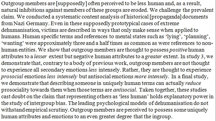 Does this preclude the idea that humans are part animal? IOW, does the study operate under the assumption that people are EITHER human OR animal but not both? Can outgroups be considered not a bad humans but animal/humans where their undesirable animalistic qualities dominate?