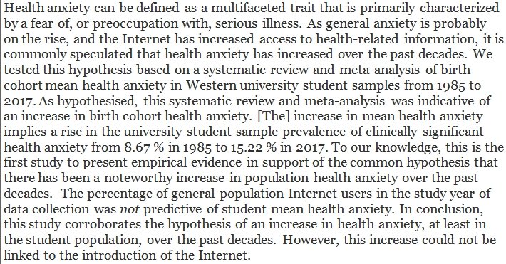 Meta-analysis: People have become more health-anxious in recent decades, and the rise can not be linked to the introduction of the Internet. https://www.sciencedirect.com/science/article/pii/S0887618520300220 …pic.twitter.com/eJzz5arvAo