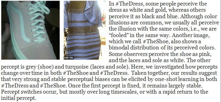 People's perception of the color of #TheDress and its counterpart, #TheShoe, remains largely stable over time, constituting "one-shot learning". https://www.sciencedirect.com/science/article/pii/S0042698920300171 …pic.twitter.com/hix8OeaMHF