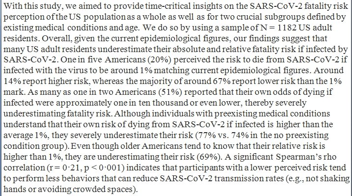 A majority of Americans underestimate their absolute and relative fatality risk if infected by SARS-CoV-2. https://psyarxiv.com/w52e9/ (Compared to epidemiological figures riddled with unknown variables)pic.twitter.com/QWADE5LURK