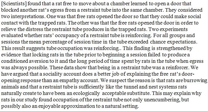 Can't read the full paper but if rats wouldn't have shown empathy in the 2011 paper then why would they have saved some chocolate for their trapped partner if they could've evidently eaten the complete portion they were given?