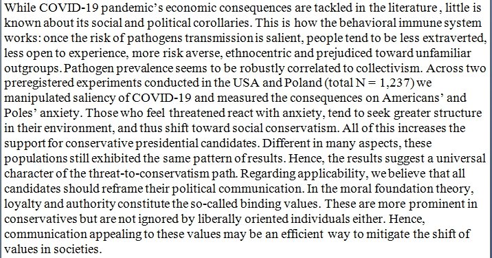 Fear of the Coronavirus induces a conservative shift in people's political mindset. https://psyarxiv.com/pjfhs/  pic.twitter.com/HIZJ5ALxgw