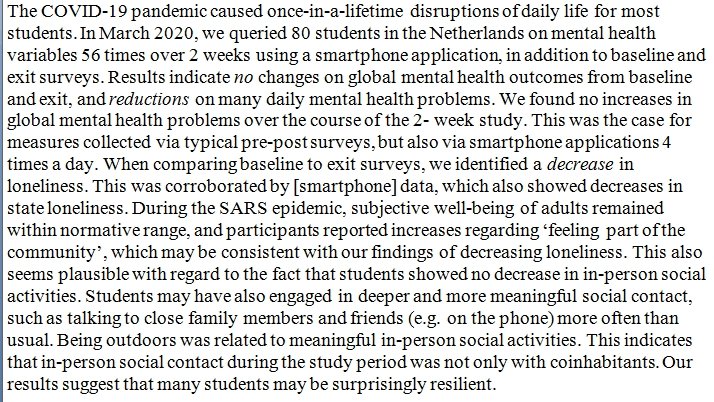 Moment-to-moment investigation reveals that students experienced no increases in global mental health problems and a decrease in loneliness during the COVID-19 lockdown. https://psyarxiv.com/36xkp/ pic.twitter.com/w6X4heFvyf