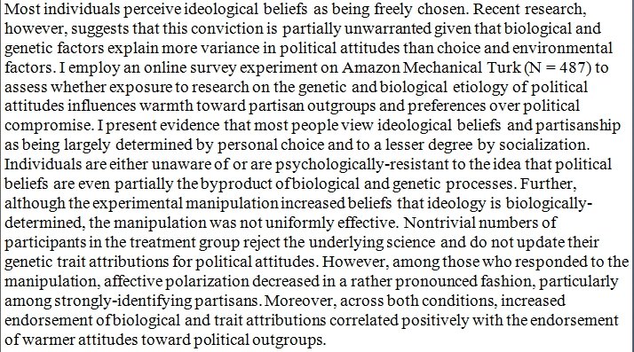 People who were taught that politics is in our genes became more friendly towards their political opponents. https://osf.io/preprints/socarxiv/7qgcr/ …pic.twitter.com/4fmdtD3LFi