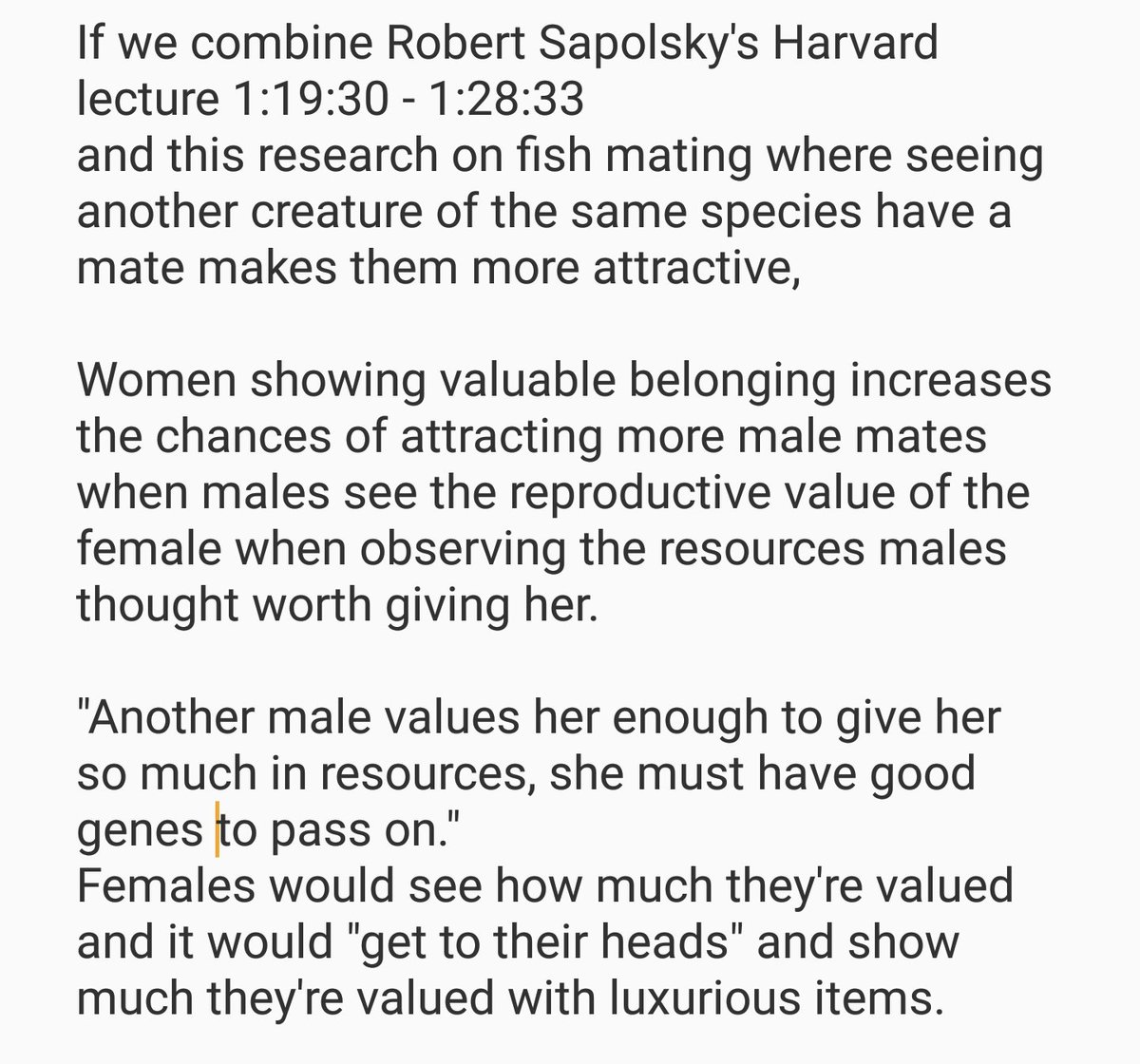 Luxurious items would signal to other males a male values her, and show she has desirable genes, so keeping what resources she has would keep her valuable appearance to pass on more genes and also have more resources for children. https://youtu.be/Y0Oa4Lp5fLE https://youtu.be/46IDb_w2CJw pic.twitter.com/26k5SNBOMS