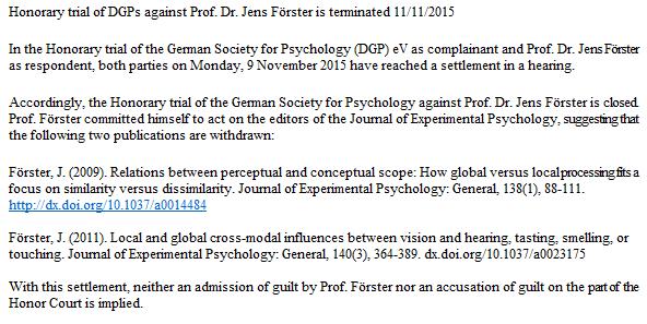 Embattled psychologists Jens Förster will call in two more retractions, in exchange for termination of proceedings. http://www.dgps.de/index.php?id=143&tx_ttnews%5Btt_news%5D=1653&cHash=43165604d2c1e810824a370002c6c8c1 …