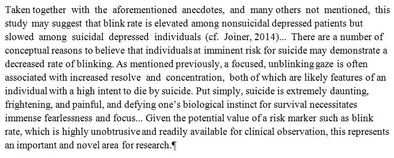 Staring Down Death: Abnormally slow eye blink rate might predict suicide risk. http://psycnet.apa.org/psycinfo/2016-03589-001/ …pic.twitter.com/PjVAWHhnjZ