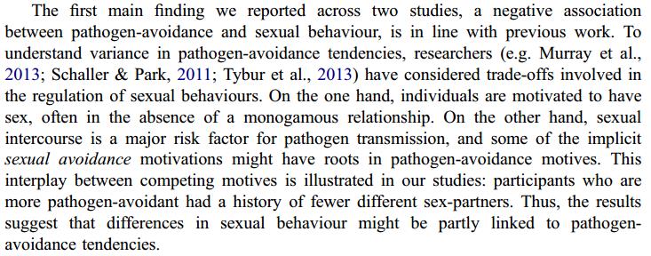 Trait pathogen avodance (repulsion by signs of sickness) was linked to fewer sexual partners http://www.tandfonline.com/doi/full/10.1080/08870446.2016.1161194 …pic.twitter.com/UXfVcpxVGH