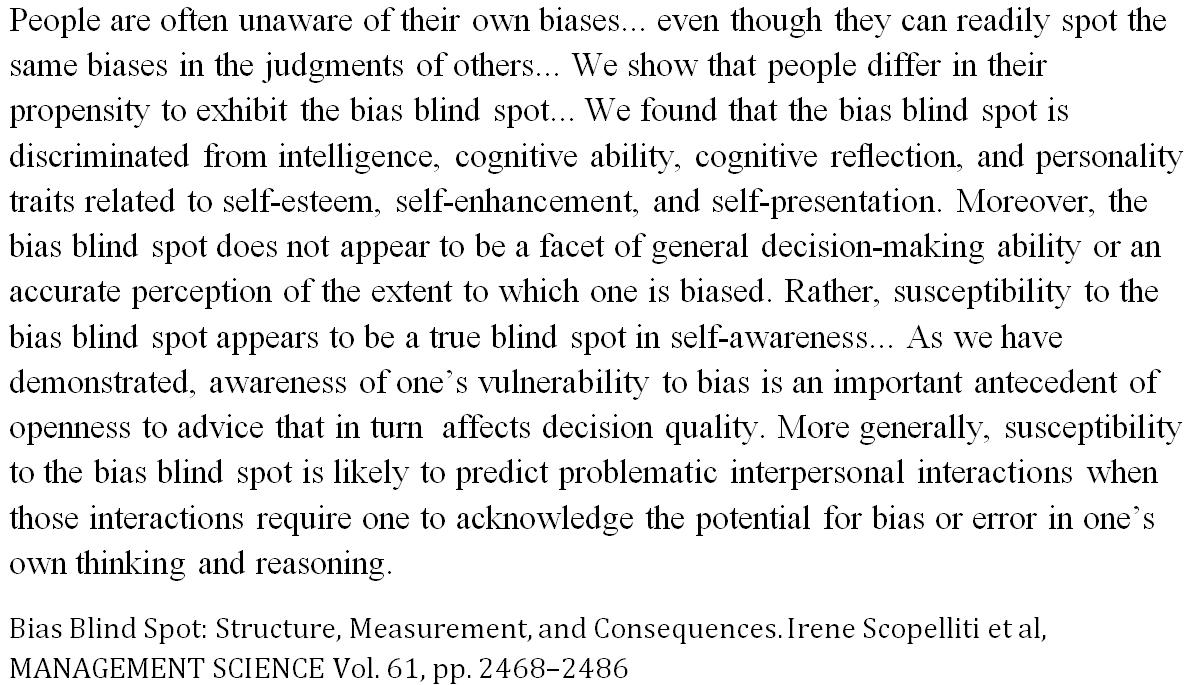 Intelligence doesn't ward off the bias blind spot: The lesser likelihood to detect bias in oneself than in others.pic.twitter.com/ZRjyl0ieg0