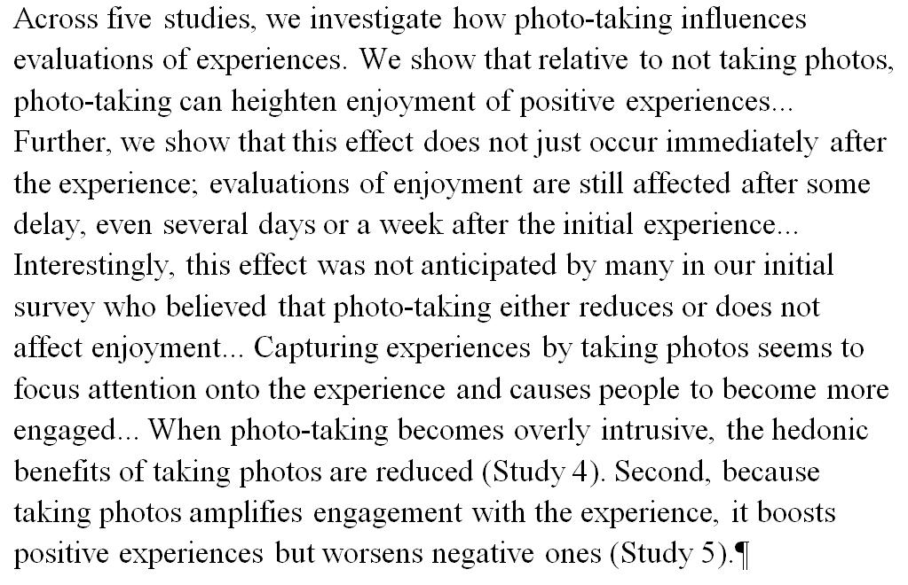 Photo-taking boosts enjoyment of positive experiences but worsens effect of negative ones. https://server1.tepper.cmu.edu/Seminars/docs/Zauberman_Do%20Photos%20Get%20in%20the%20Way%20final2%20Feb15.pdf …pic.twitter.com/FuOo0sBqnN