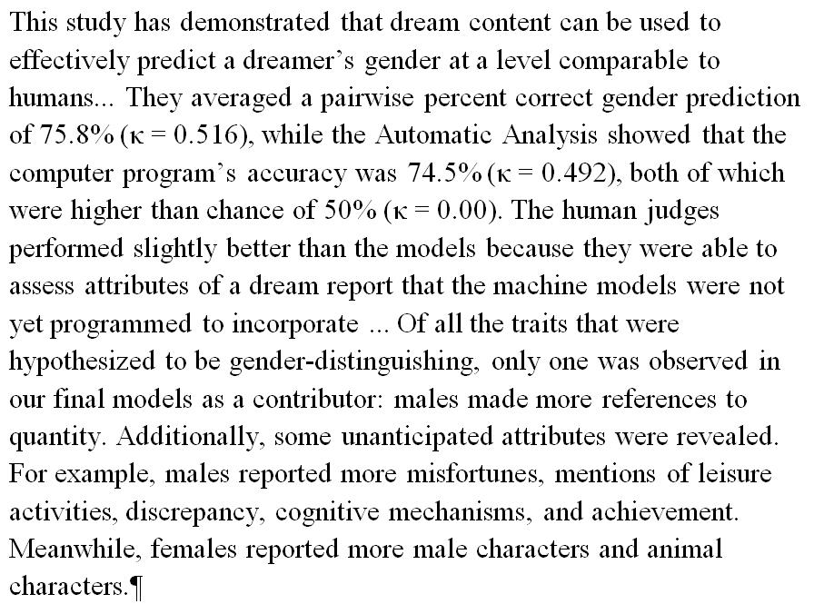 People and computer program could gauge dreamer's gender from dream content quite well. http://www.sciencedirect.com/science/article/pii/S1053810016301313 …pic.twitter.com/OhrYtqIQLt