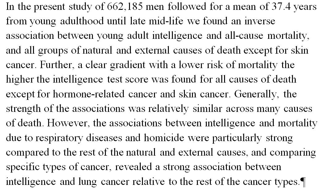 Higher IQ in youth predicted lower mortality over 37 yrs, esp from resp. disease & homicide. http://www.sciencedirect.com/science/article/pii/S0160289616302331 …pic.twitter.com/kg97rCHNyb