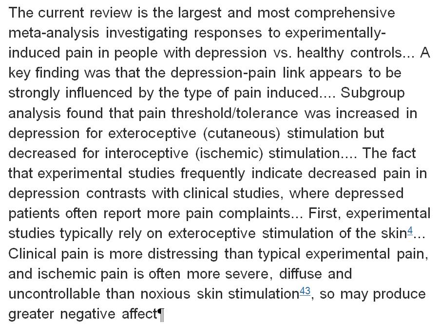 Depression is associated with a reduced sensitivity to exteroceptive (cutaneous) pain. http://www.sciencedirect.com/science/article/pii/S1526590016302024 …pic.twitter.com/PVlRooVJjv