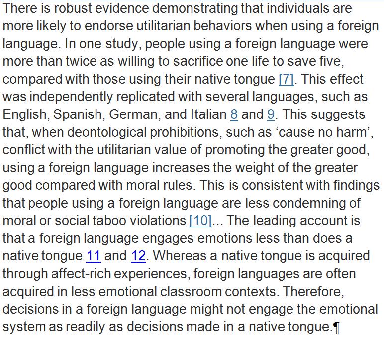 People are more likely to make utilitarian judgements when using a foreign language. http://www.sciencedirect.com/science/article/pii/S1364661316301218 …pic.twitter.com/ZyMGCtB2He
