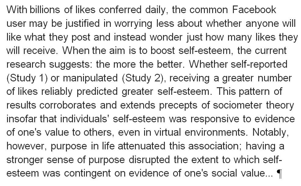 Bagging likes on social media raises self esteem, esp for those with little purpose in life. http://www.sciencedirect.com/science/article/pii/S0022103116303377 …pic.twitter.com/gkhPUzn28G