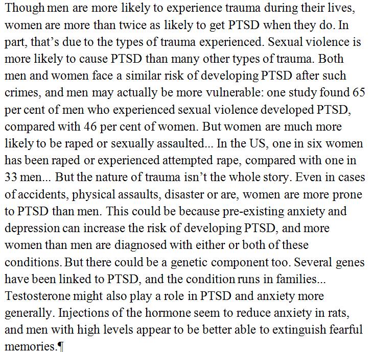 Men are more likely to experience trauma, but women are more likely to get PTSD if they do https://www.newscientist.com/article/mg23130910-400-to-stop-ptsd-we-need-to-know-why-women-are-more-at-risk/ …pic.twitter.com/2JetkK9Yah