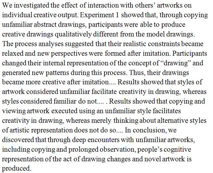 Inspiration by imitation: After copying unfamiliar abstract artworks, subjects' own drawings became more creative. http://onlinelibrary.wiley.com/doi/10.1111/cogs.12442/full …pic.twitter.com/bMBMrHYwXu