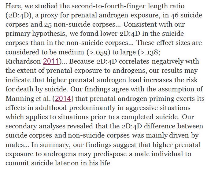 Males who committed suicide had a lower second-to-fourth-finger length ratio, i.e. higher prenatal androgen exposure http://link.springer.com/article/10.1007/s00702-016-1608-4 …pic.twitter.com/u9fzhTN4Yl