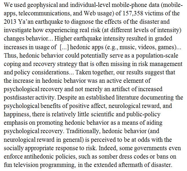 The stronger an earthquake had been, the more people resorted to mobile entertainment afterwards. http://pss.sagepub.com/content/early/2016/11/22/0956797616671712.abstract …pic.twitter.com/LEmMOUcD7r
