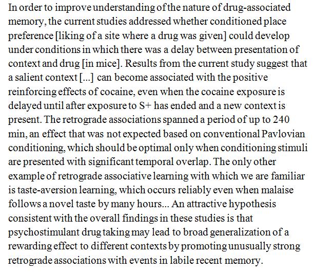 Against learning theory, cocaine administration created a preference for places that had been visited 4 hrs earlier. http://link.springer.com/article/10.1007/s00213-016-4482-8 …pic.twitter.com/AkErqiwRmV