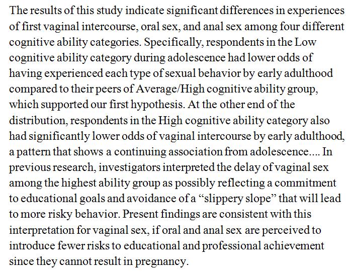 Adolescents in the lowest AND highest cognitive ability group were the least likely to already have had sex. http://www.tandfonline.com/doi/full/10.1080/00224499.2016.1247149 …pic.twitter.com/ASQv0jvNMj