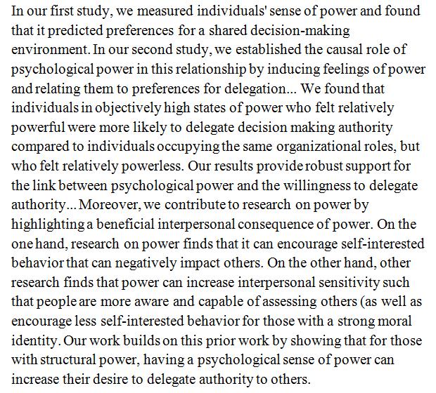 People who felt relatively powerful were readier to delegate decision making authority than those feeling powerless. http://www.sciencedirect.com/science/article/pii/S0191886916311527 …pic.twitter.com/qcHIHDMxdG