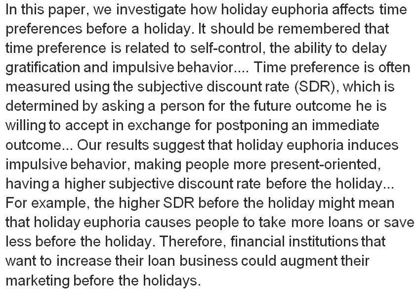 "Holiday euphoria induces impulsive behavior, making people more present-oriented." http://www.sciencedirect.com/science/article/pii/S2214804316300817 …pic.twitter.com/UeqI56viLz