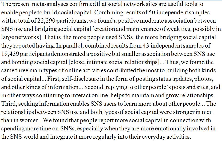 50 independent samples with 22,290 participants can't err: Social media help build social capital. (Roy Baumeister) http://psycnet.apa.org/journals/gpr/20/4/369/ …pic.twitter.com/VRXodlGQr1