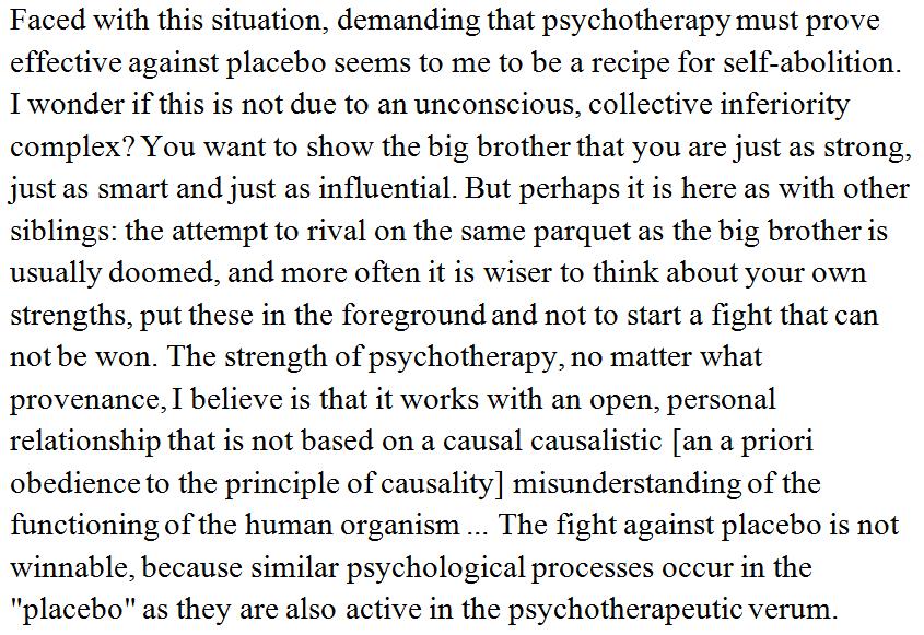 Renowned German therapy researcher advises psychotherapy not to even try to prove superiority over the placebo. https://www.karger.com/Article/Abstract/453050 …pic.twitter.com/jznAee4dop