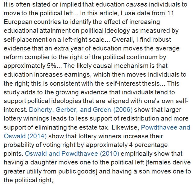 maybe the correlatie education / being right, is U shaped. Some education make people more left, and extra education right again?