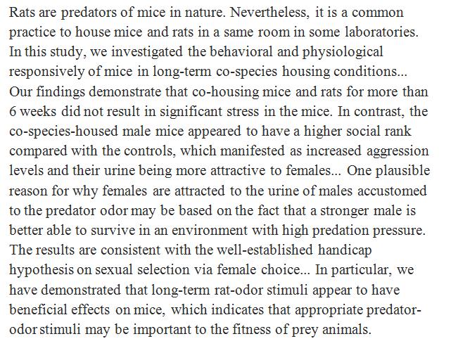 Male mice that had been housed together with rats became more dominant and more attractive to female mice. https://academic.oup.com/chemse/article-abstract/doi/10.1093/chemse/bjw164/2884612/Chronic-Co-species-Housing-Mice-and-Rats-Increased?redirectedFrom=fulltext …pic.twitter.com/Hz4xKGfG6H