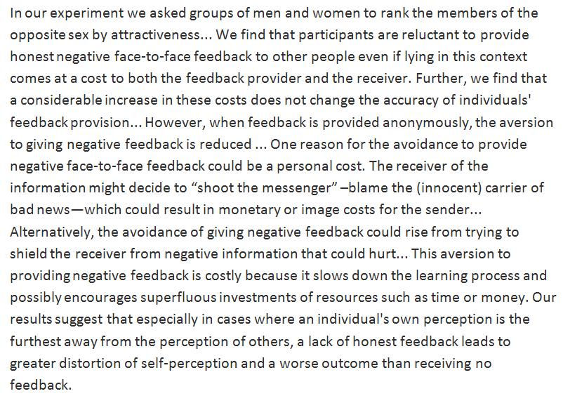 Sounds like there could be an evolutionary advantage to giving no feedback.