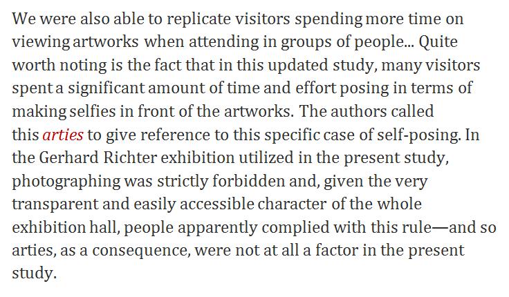Many visitors of an art exhibition posed in front of the artwork shooting selfies (neologism: arities). http://journals.sagepub.com/doi/full/10.1177/2041669517694184 …pic.twitter.com/qcHtrE3Twp