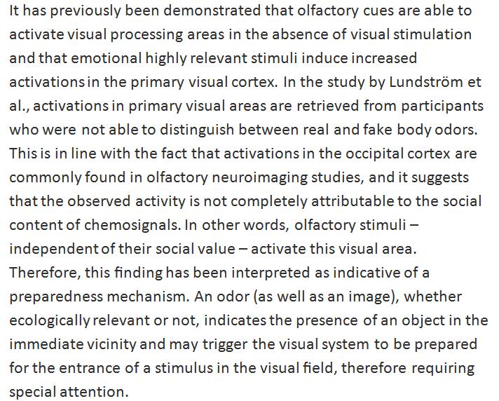 Seeing smells? Odors activate the primary visual cortex, the brain's port of call for optical stimuli. https://www.springerprofessional.de/processing-of-human-body-odors/12098640 …pic.twitter.com/4hENy6MrOE