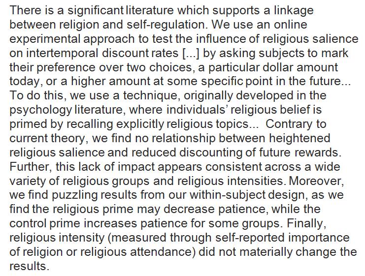 Even God won't make priming work: Religious primes don't make people forego smaller present 4 larger future rewards. http://www.sciencedirect.com/science/article/pii/S2214804316301240 …pic.twitter.com/q7RiFSOCUT