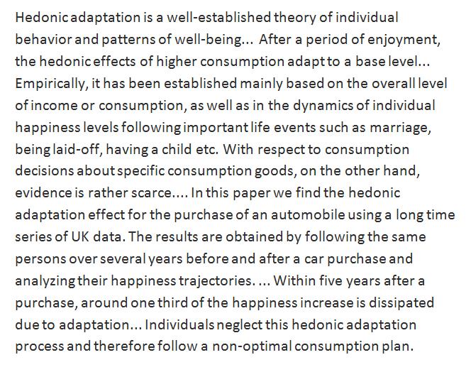 Within 5 yrs after a car purchase, about one third of the obtained happiness increase is eaten up due to adaptation. http://www.sciencedirect.com/science/article/pii/S0167487017301319 …pic.twitter.com/DKmoVnI78S