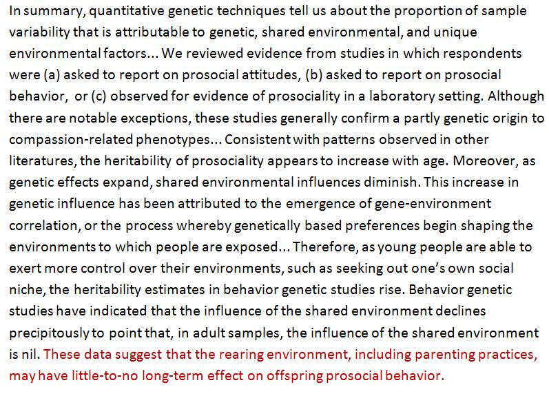 "The rearing environment [...] may have little-to-no long-term effect on offspring prosocial behavior." https://books.google.de/books?hl=de&lr=&id=dZy8DgAAQBAJ&oi=fnd&pg=PT264&dq=%22behavior+genetics+of+prosocial+behavior%22&ots=7rp85UZgj_&sig=1N3C9KjUiDRjuVcyq7Nd24lsRqo#v=onepage&q=%22behavior%20genetics%20of%20prosocial%20behavior%22&f=false …pic.twitter.com/xtn29mcC9x