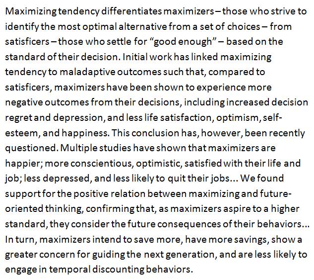 Maximizers are better than their reputation, leading a happier and more foresightful life. http://econtent.hogrefe.com/doi/abs/10.1027/1614-0001/a000226 …pic.twitter.com/vFMUI3AICJ