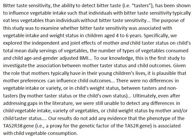 Contrary to conventional wisdom, bitter taste sensitivity had absolutely no effect on children's vegetable intake. http://search.proquest.com/openview/e2753ab0d9a625b4c2717dabd2d8dcd5/1?pq-origsite=gscholar&cbl=18750&diss=y …pic.twitter.com/FhByv4JEOf