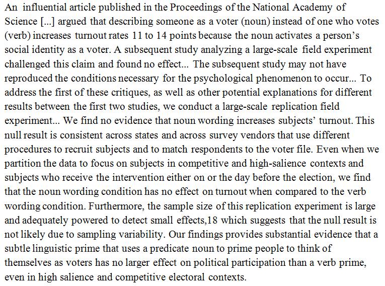 Another priming debacle: Addressing voters with a noun, rather than a verb, REALLY doesn't increase turnout rates. http://huber.research.yale.edu/materials/73_paper.pdf …pic.twitter.com/qH0AQvzMCq